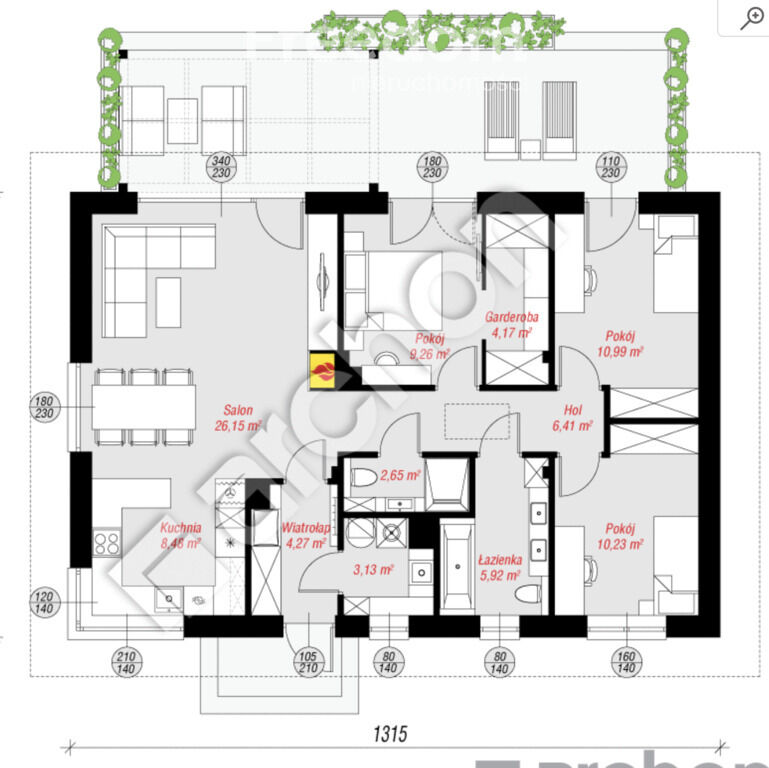 pozostają dwie łazienki. Przewidziana przy wiatrołapie kotłownia
